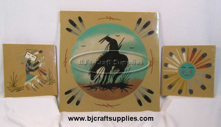 American Indian Art Wall Hangings Sand Art - Perfect for your wall or makes a great gift! Set of 3 hand painted sand art paintings. Includes 1 - large 12" x 12", and 2 - small 6" x 6" sand art paintings. Regularly priced 39.99. Clearance priced at 25% off!General Information: